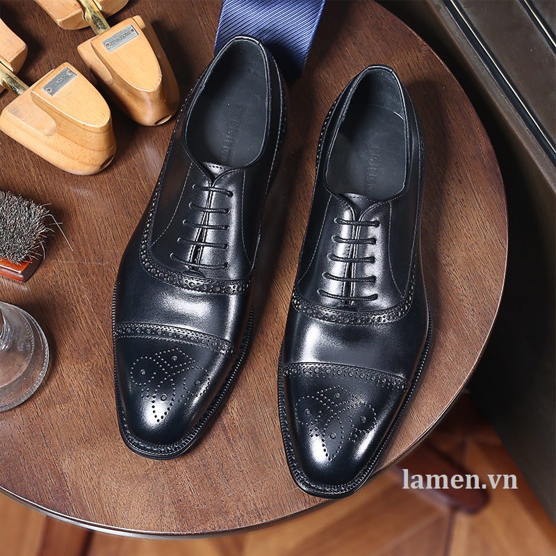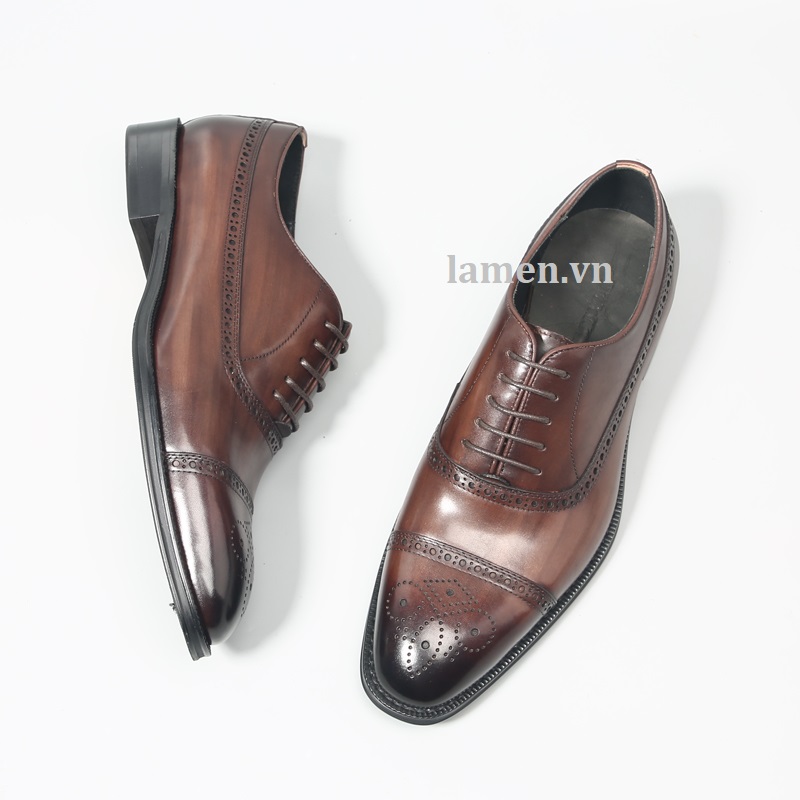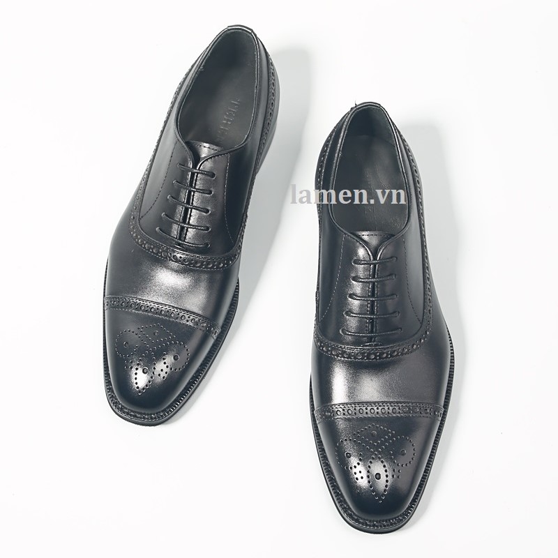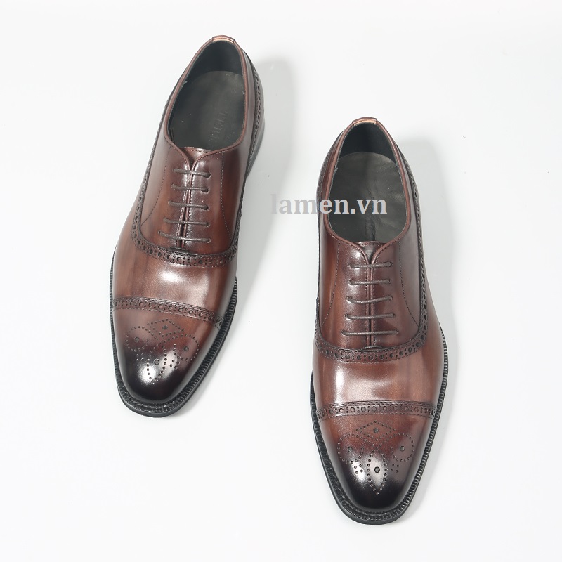 Giày Tây Nam Công Sở Oxford Half Brogue - Da ngoài (upper): da bò - Lót ngoài (uperlining): da dê - Lót trong (sock lining): da dê - Đế (outsole): cao su. - Màu sắc: được đánh sơn bằng tay. - Handmade 100% * Thiết kế buộc dây trẻ trung, sang trọng và lịch lãm dễ dàng phối với tây, Vest, suit và Kaki.